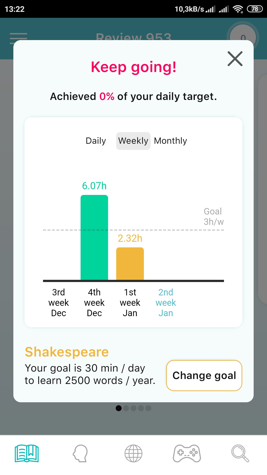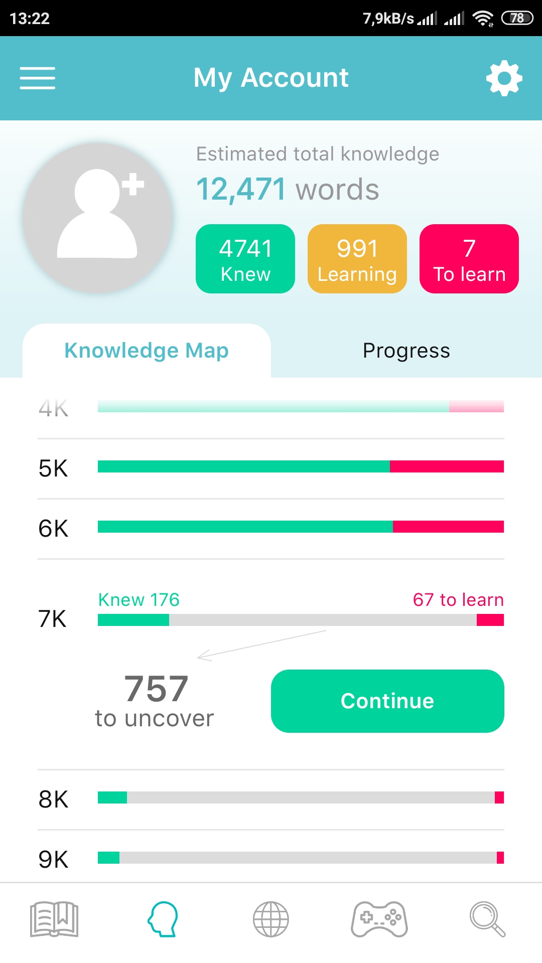Dzięki aplikacji WorUp można nadzorować swoje postępy. Daje wgląd do słówek aktualnie znanych oraz tych które opanowaliśmy w różny stopniu procentowym. Można ją odłożyć na kilka dni czy nawet tygodni i wrócić do nauki w dowolnym momencie.